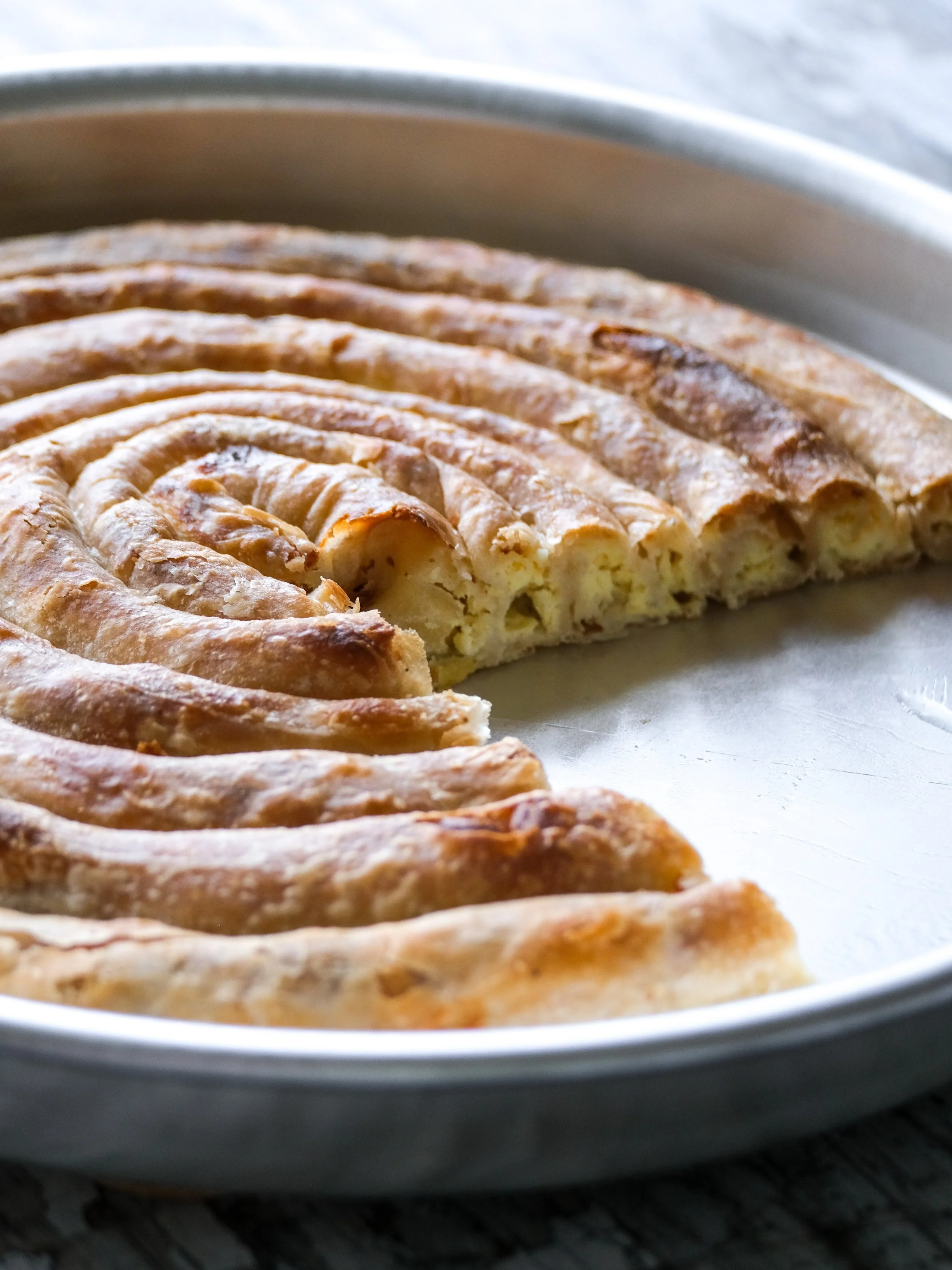 Generously grease a round baking pan. Starting in the center, coil the burek around itself until the pan is filled. If you have any dough left, shape it into smaller spirals and bake them separately. Brush the top lightly with oil.